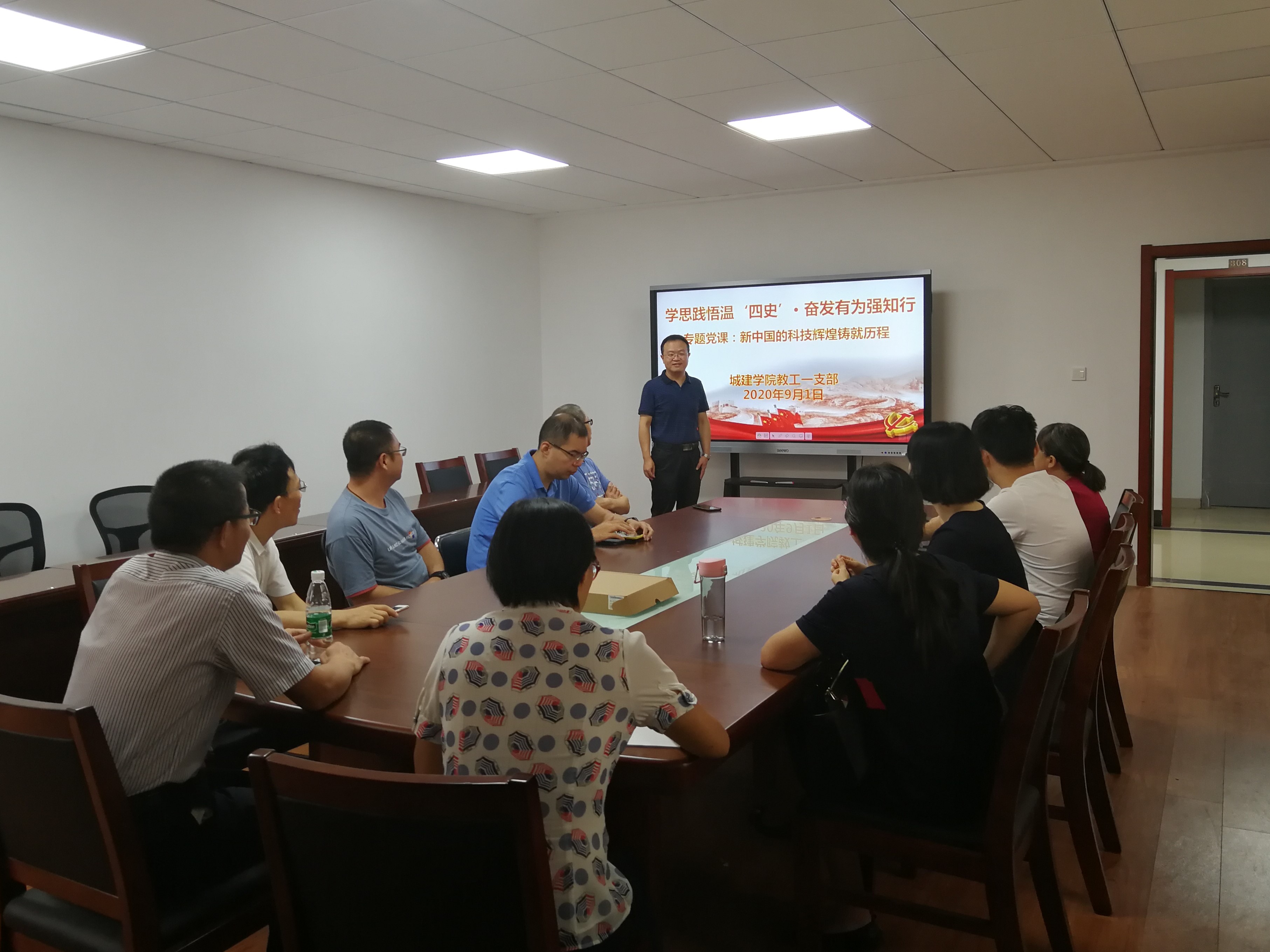 2020年9月1日午,城建公司教工一支部举行学思践悟温‘四史’·奋发有为强知行”主题教育活动,由支部书记、副经理牛晓峰同志给支部党员讲授“新中国的科技辉煌铸就历程专题党课