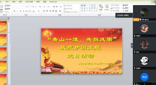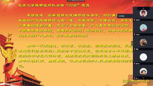 5月2日下午两点半,城建公司研究生第一党支部线上开展了以“青山一道,共担风雨”战疫护国主题党日活动。本次党日活动主题由党支部书记带领支委共同拟定,主要分为四个部分:学习习近平总书记关于新冠疫情防控的系列重要讲话、观看武汉抗疫纪录片《见证》、学习《习近平给北京大学援鄂医疗队全体“90”后党员的回信》、全体党员进行交流探讨四个部分。