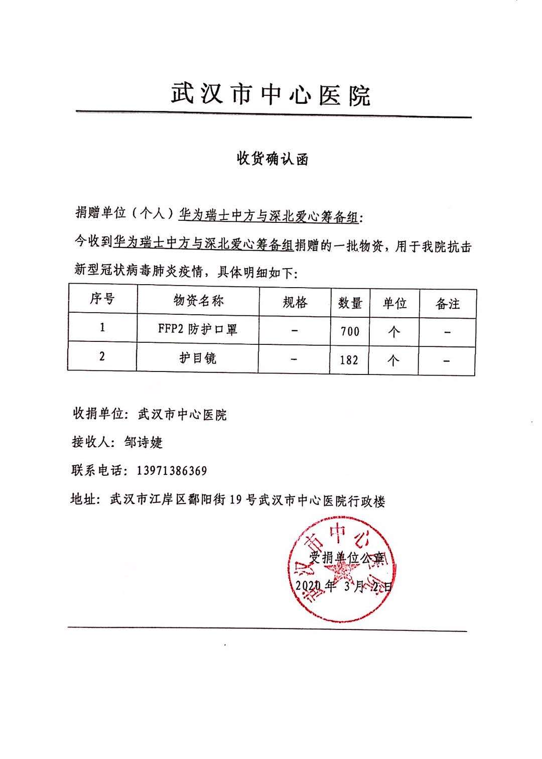 教工一支部的张广丽老师,2月中旬,捐款2000元参与华为瑞士中方与深北爱心筹备组,为武汉市中心医院捐赠FFP2防护口罩、护目镜等一批紧急医疗物资。