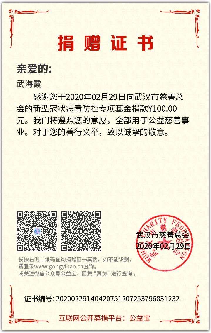 武海霞、张雪娟、王思琪、赵海良、杨君丽等几位同志,纷纷慷慨解囊,通过武汉慈善总会、红十字会等渠道为疫区捐款,为抗击疫情贡献出自己的力量。