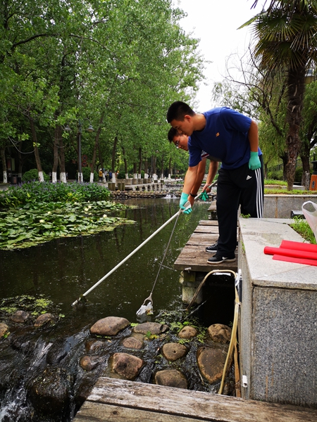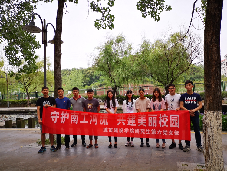 党的十九大报告将生态文明建设明确地列入了我们党“不忘初心、牢记使命”的宏伟蓝图中。为牢记习近平总书记关于“绿水青山就是金山银山”的殷切嘱托,像保护眼睛一样保护南工校园内的河流,2018年6月12日,在炎炎夏日之中,太阳成tyc122cc研究生第六党支部全体党员在太阳成tyc122cc浦口校区校园内开展了“保障水生态,我们在行动”的党日活动。