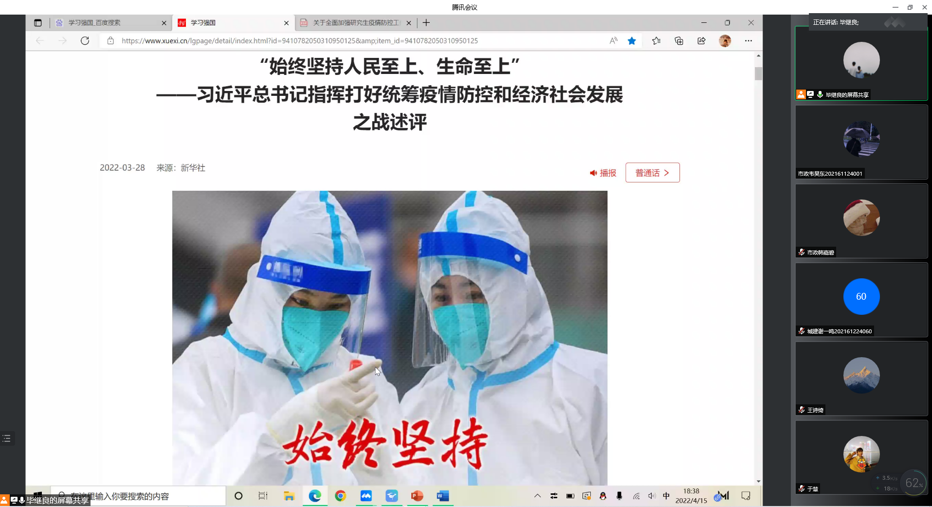 2022年4月15日晚上太阳成tyc122cc市政研究生党支部举行了“抗击疫情,从我做起”倡议活动,倡议党员充分发挥先锋模范作用。本次活动根据公司疫情防控的规定采取线上方式进行,支部全体党员参加了活动。活动由支部书记毕继良主持。
