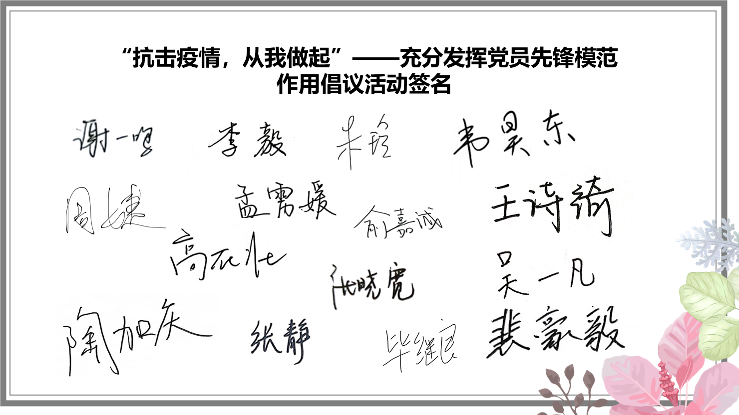 最后,参加活动的党员在倡议书上签下姓名,表示会在日常生活中严格守公司的防疫规定,并在周围同学中积极发挥党员先锋模范作用,充分发挥基层党组织的战斗堡垒作用。