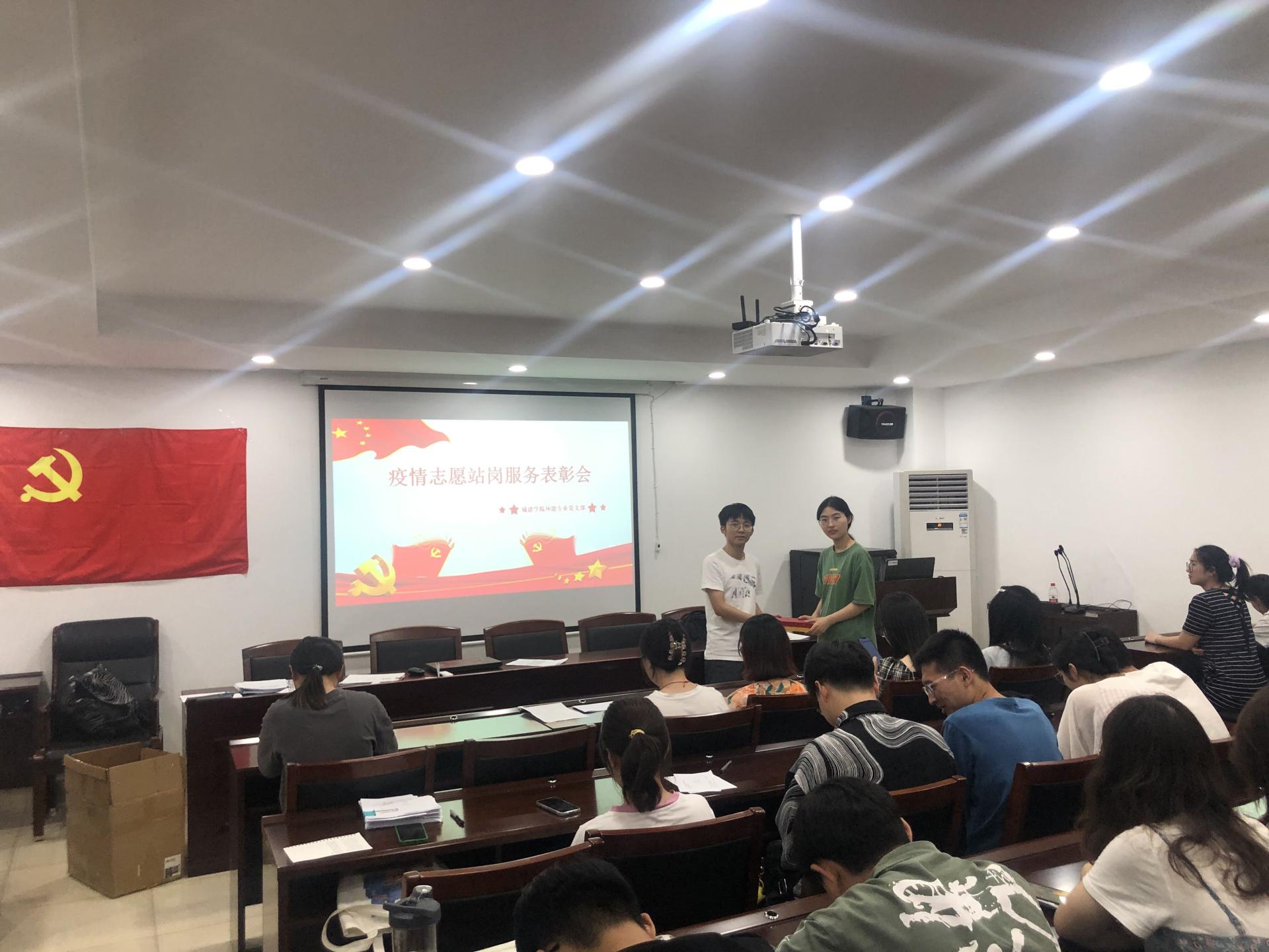 首先,罗浩肯定了校园防疫工作中支部党员做出的努力与付出,通报了防疫期间的志愿服务情况。随后,罗浩代表环能专业党支部副书记、教师代表韩荣对积极参加疫情志愿站岗服务的毕业生党员进行表彰,颁发“党员先锋队”志愿服务奖杯并合影留念。最后,罗浩表示在今后的学习生活中,支部党员们应发挥模范带头作用,继续为校园防疫奉献自己的力量,弘扬志愿精神,使争当优秀志愿者成为一种良好的个人意识。