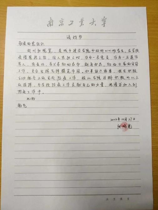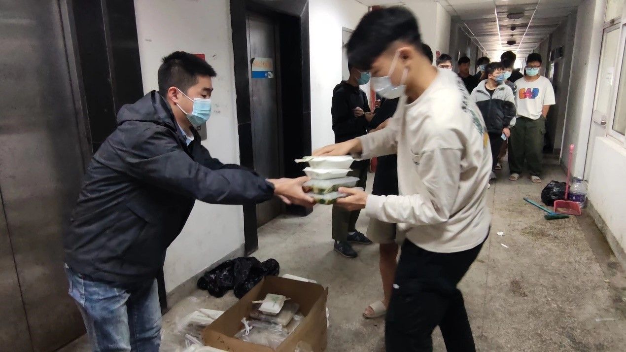 校园封闭管理以来,员工党员冲锋在前,亮身份、当先锋、做表率,尽己所能担起责任,贡献力量。作为员工党员,研究生各班班长和团支书快速组织开展人员摸排,统计在景星苑宿舍的人员名单,确保不漏一人;市政研究生党支部的张晓宽,作为退役军人,他认识到此次疫情防控必然艰巨,果断向党组织递交请战书,积极加入四层志愿服务小队,配合层长完成好饭食登记发放工作,保证同学有序就餐;暖通研究生党支部的王冠群和蔡欣容同学,在了解到大家基本生活物资充足,但缺少新鲜的水果时,第一时间安排统计大家缺少的物资,统一采购送至景星苑宿舍楼下。