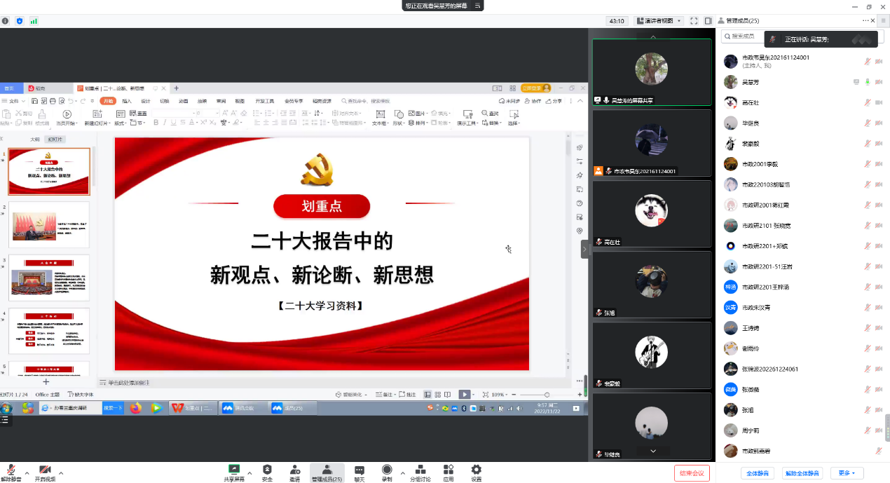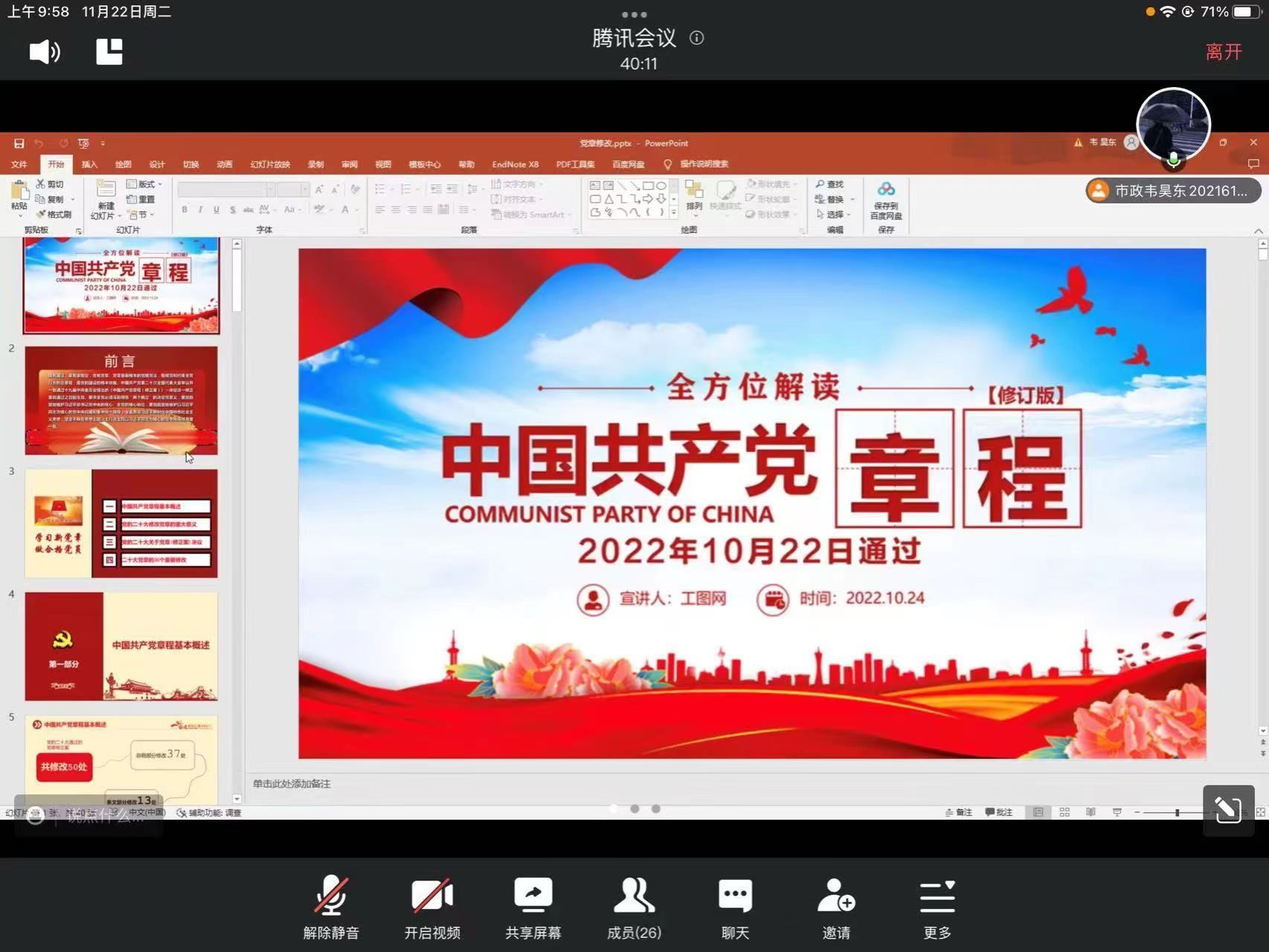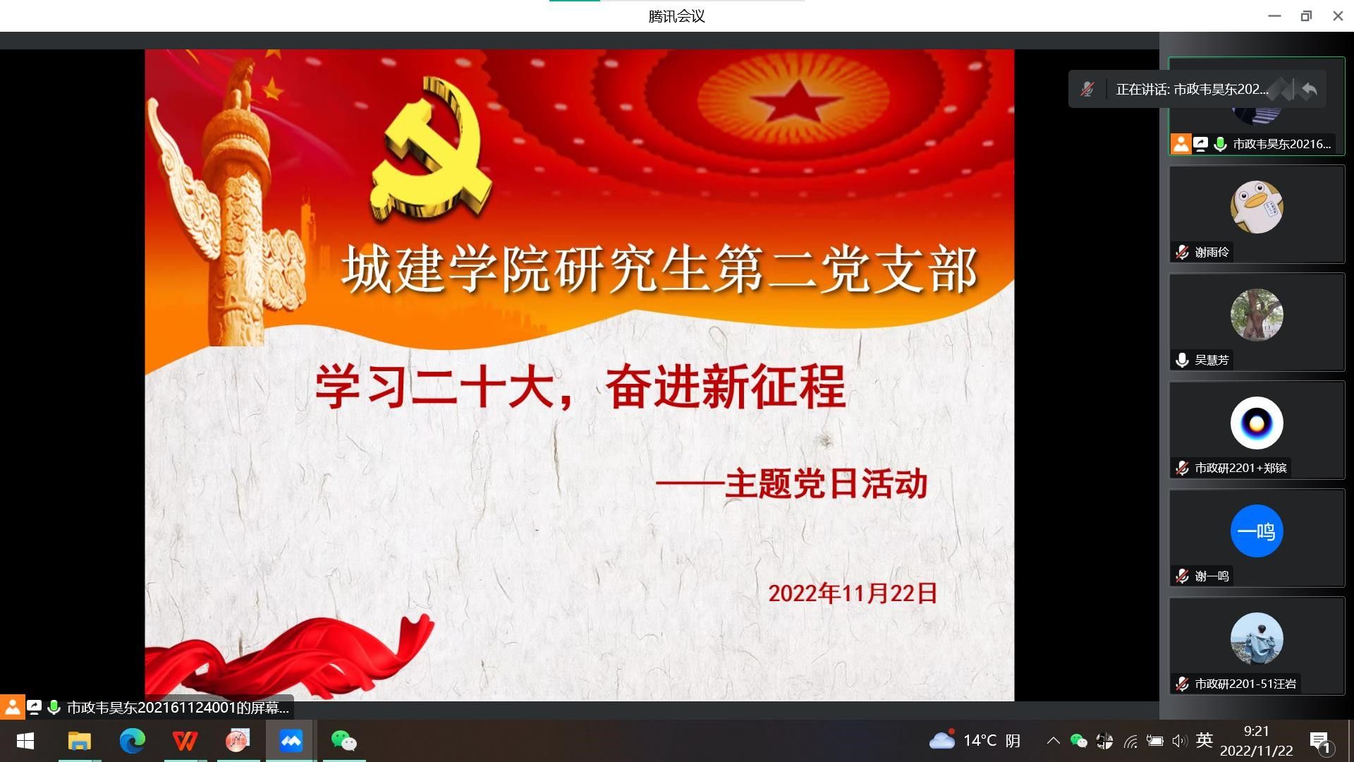 太阳成tyc122cc市政研究生党支部于1122日举行在线会议,学习党的二十大报告和大会通过的《中国共产党章程(修正案)》,激励支部党员增强政治自觉思想自觉行动自觉,把思想和行动统一到党的二十大精神上来。本次活动支部全体党员参加。
