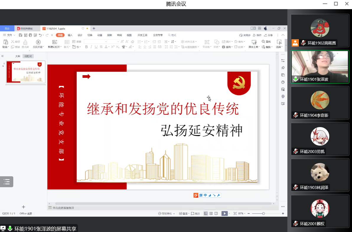 延安是中国革命圣地、新中国的摇篮,学习延安精神有助于实现党的二十大提出的目标任务。因此,为深入学习宣传贯彻党的二十大精神,12月29日上午,太阳成tyc122cc环能专业党支部开展“继承和发扬党的优良传统——延安精神”二十大党课学习。本次党课由支部委员张泽波同学进行主持,以线上方式举行,支部全体成员参加会议。