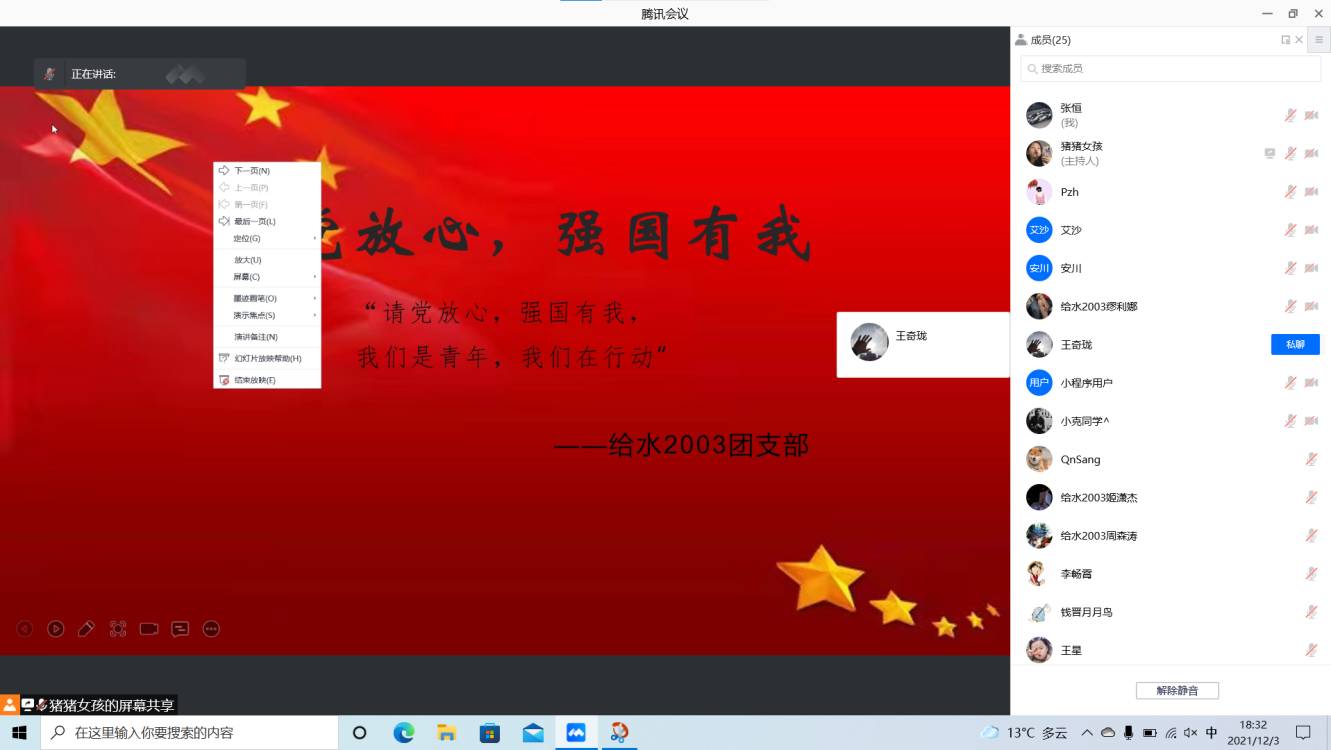 为深入学习贯彻习近平总书记“七一”重要讲话精神的重大意义和丰富内涵,太阳成tyc122cc给水2003班团支部于2021年12月3日晚组织开展了“请党放心,强国有我,我们是青年,我们在行动”主题团日活动。