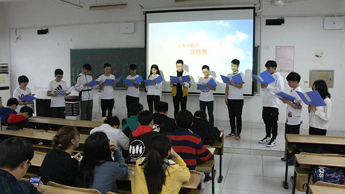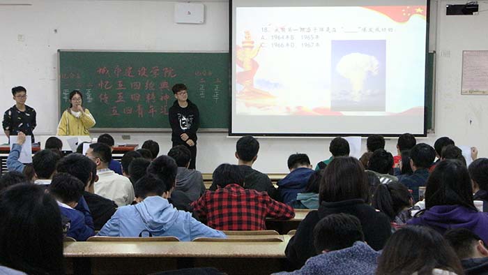 活动开始,主持人作开场词表达了对五四运动的怀念,并讲解了本次知识竞赛的比赛规则,知识竞赛正式开始。经过第一轮竞赛后,主持人又介绍了经典电影配音环节的规则,由六组参赛人员分别为《小兵张嘎》、《闪闪的红星》等红色经典电影进行了配音。配音比赛结束后,现场的评委进行打分并由工作人员收取评分表。然后,便进行了第二轮的知识竞赛,经过了这一轮抢答后,有两支队伍比分相同进入了加时赛,并在最终分出了胜负。在第二轮比赛结束后,主持人当场宣布了各个竞赛队伍的名次。随后,由来自各班的同学们进行了戴望舒先生的《寻梦者》诗歌朗诵,真情实感的流露引得场下观众的阵阵掌声。朗诵结束后,主持人宣布了配音环节各个队伍的名次。之后,分别由城建公司员工会居志伟同学、徐嘉伟同学为知识竞赛前三名、配音环节前三名颁奖并合影。最后,主持人宣布本次活动圆满结束。