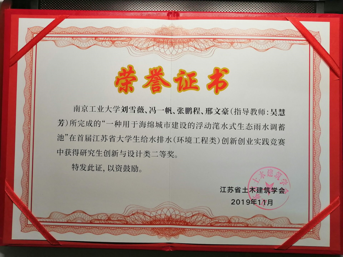在本次大赛中,由公司吴慧芳老师指导的刘雪薇、冯一帆、张鹏程、邢文豪同学的“一种用于海绵城市建设的浮动滗水式生态雨水调蓄池”和万志远、张国庆、王俊萍、刘雪薇、钟涛、岳灵芝、秦宇同学的“海绵绿洲·锦绣江苏——江苏省海绵城市建设调查研究”分别荣获创新与设计类二等奖和作品类三等奖,展示公司员工扎实的专业功底和勇于探索的创新精神。