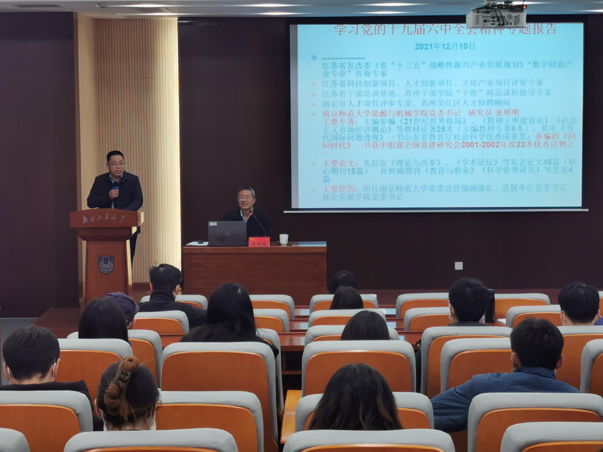 为进一步深入学习党的十九届六中全会精神,太阳成tyc122cc于12月10日下午特邀南京师范大学能源与机械工程公司党委书记、研究员张明明为全公司党员同志与师生代表带来学习党的十九届六中全会精神专题报告。学习报告会由公司党委书记段然堂主持。