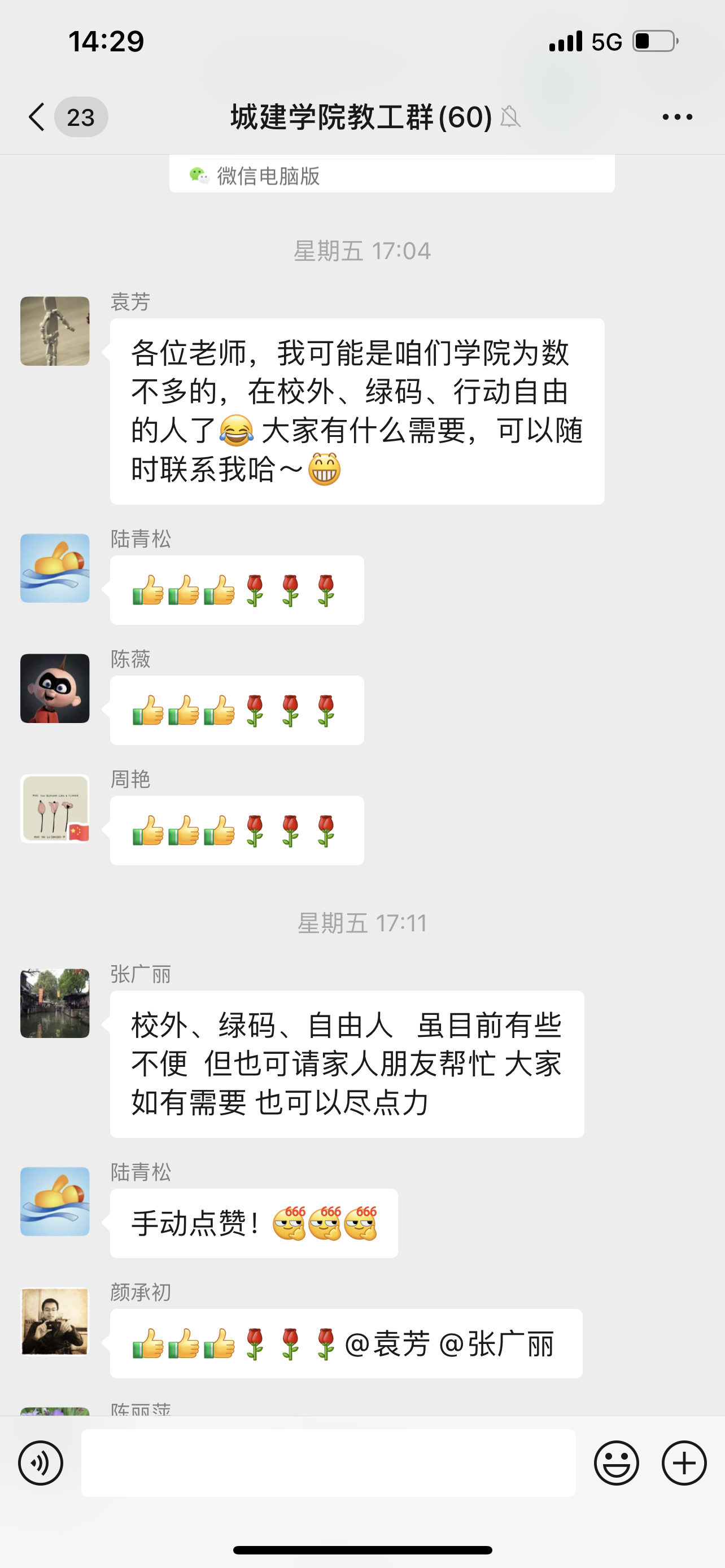 “我们在外面、你们在里面,你们有需要,我想办法来帮助大家,尽一份绵薄之力”、“我是绿码,我可以正常同行,大家家里有需要的话,我可以替大家做些事情”、“你的电脑在哪个工位,我给你送到景星苑楼下去,不要耽误了学习”等等只言片语,公司党员教工李骅和李韬两位青年教师主动请缨参加教团队格考试员工外出带队工作,员工党员向党支部主动提交“疫情请战书”。。。。。无处不彰显出全院师生共克时艰高昂的精气神、深厚的战友情与师生情,我们坚信上下齐心其利断金。