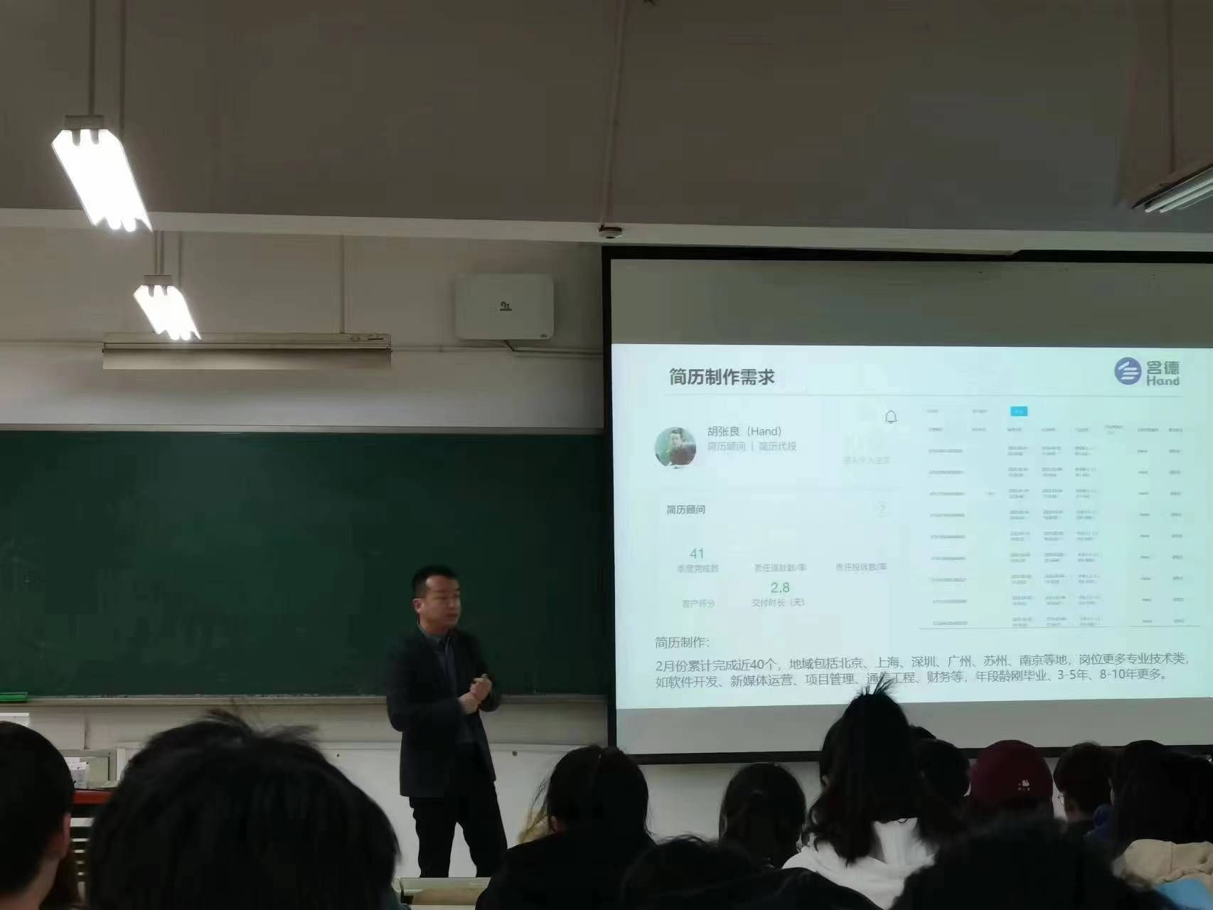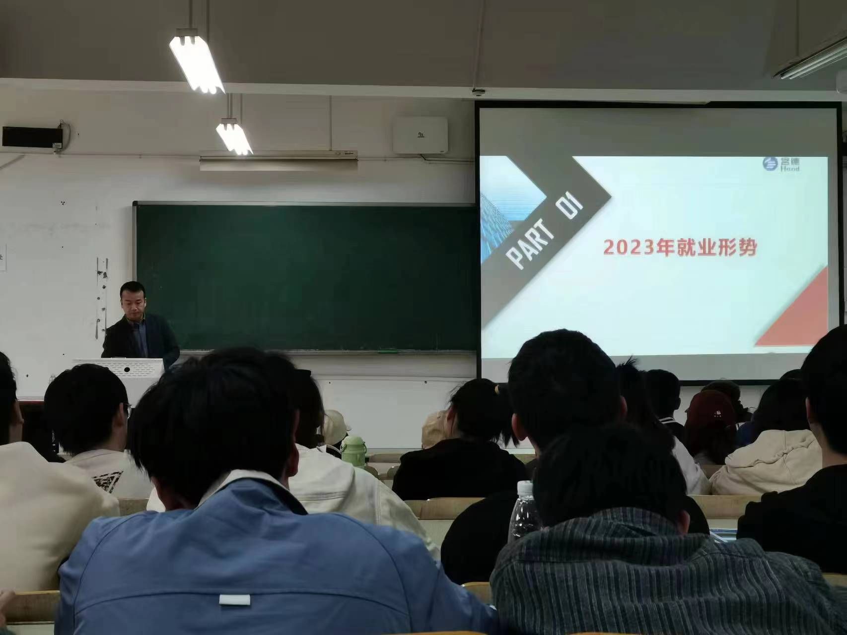在讲座中,胡老师通过数据深刻分析了近年来应届生就业市场以及环境趋势变化,详细介绍了自己在工作中接触到的近几年大学生就业、升学情况,列举并详解就业过程中可能会遇到的问题,为同学们的下一步努力指明了方向。最后,胡老师还提出了宝贵的就业意见,希望同学能充分认识自我,做好就业定位和决策,确立合适的就业目标,找准时机把握机会,鼓励大家在即将到来的就业热潮中拥抱新职业,正视新挑战。