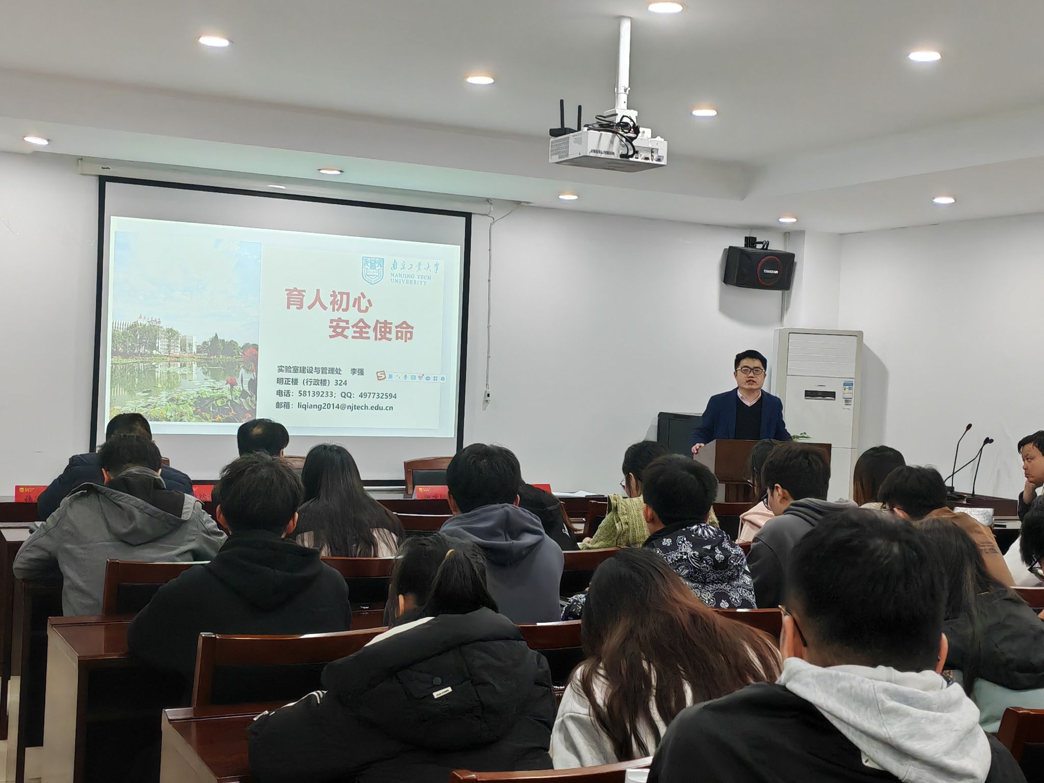 会上,段然堂书记在动员讲话中就当前安全形势、主要任务、安防意识及应急管理等做了介绍和提出了要求。校实验室建设与管理处李强科长作了“育人初心,安全使命 ”的报告,报告通过分析近期高校实验室发生的安全事故,用事例告诉师生如何防和应对实验室突发事故和火灾等;同时,提出了实验室普遍存在的安全问题和应对措施。南京安民消防教员从南京2.23火灾事故讲起,阐明容易引发火灾的主要原因,就如何应对、处突和自救进行辅导。报告会后,在安民消防教员的指导下,入会师生进行了应急逃生疏散演练,手把手教员工如何使用灭火器及防烟面具等。