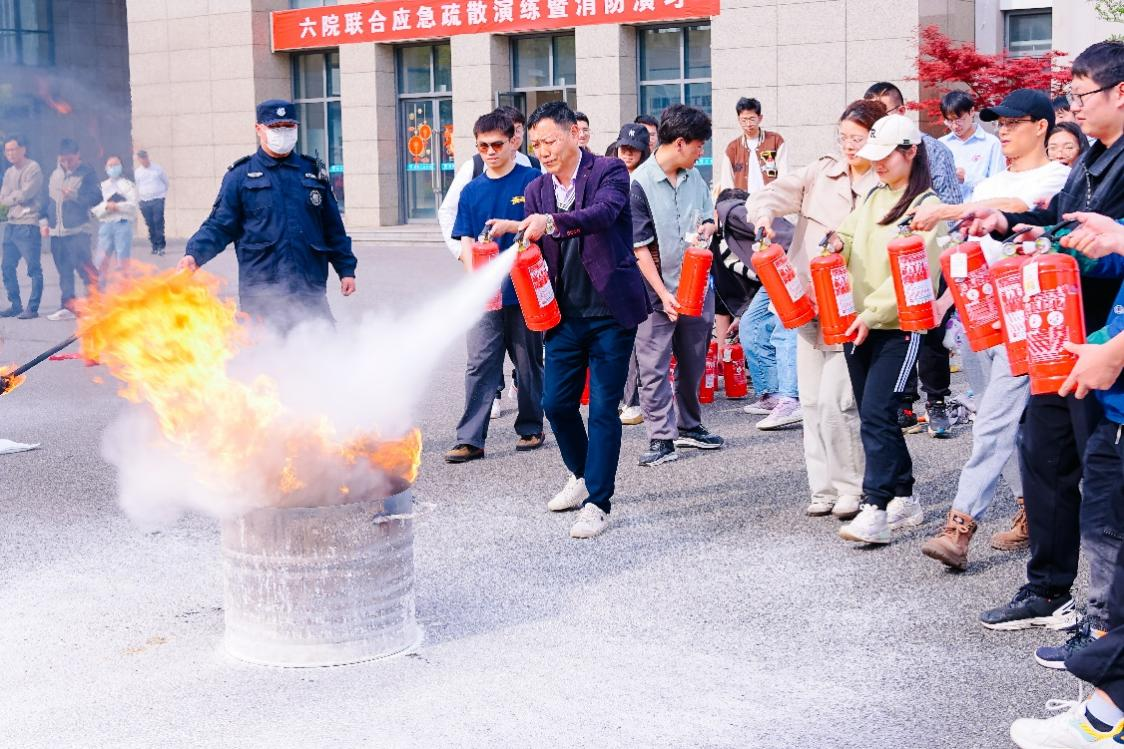 会议结束之际,消防警报声响起,六个公司的师生代表进行应急疏散演练,并开展消防演习。在演习前先进行了消防知识的趣味问答环节,与会人员积极参加,气氛热烈。演习中包括消防防毒面具、灭火毯和灭火器的使用说明培训和现场实操。