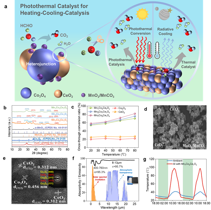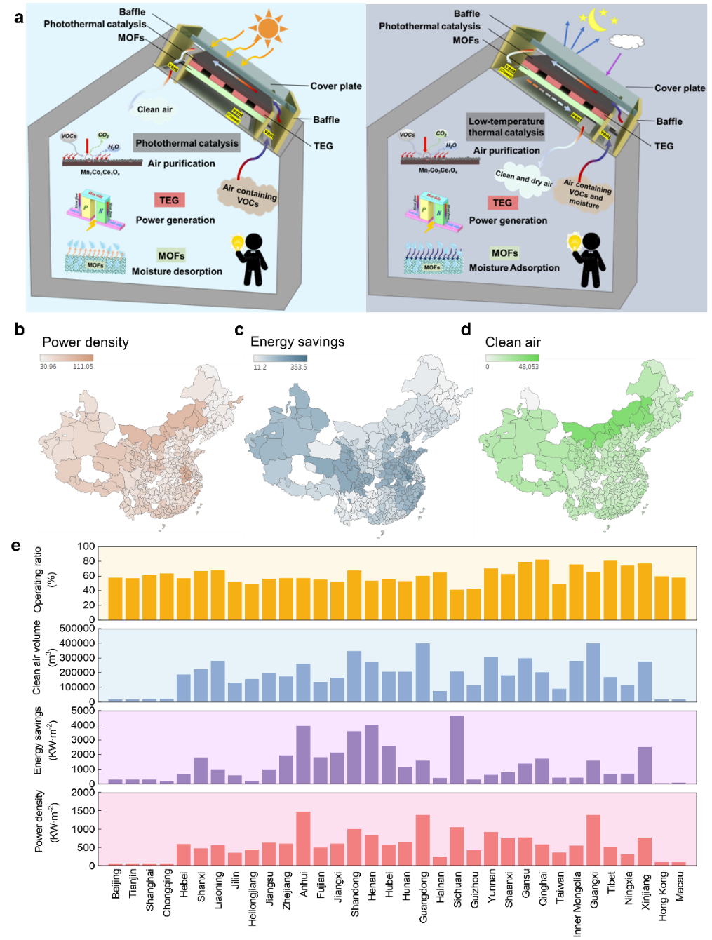 团队开发新型红外光驱动光热催化材料Mn7Co3Ce1Ox,全光谱太阳能吸收率为 94.3%、大气窗口发射率为 95.7%,对室内VOCs去除率达 90.9%,材料具有净化、集热、辐射制冷多重功能。此外结合Mn7Co3Ce1Ox材料、温差发电(TEG)和金属有机框架材料(MOFs),提出PTC-TEG-MOF混合系统,协同利用Mn7Co3Ce1Ox白天集热-催化、夜间辐射制冷效应与MOFs材料白天脱附吸热-夜间除湿放热效应,实现发电、除湿和空气净化功能。结果表明,系统电功率提升 640.1%,室内湿度降低 16.8%,产生干净空气 270.8 m³·h⁻¹·m⁻²。在中国省会城市建筑应用时,年功率为 30-105.3 kW·m⁻²,空调节能为 11.2-353.5 kW·m⁻²,干净空气为 296.3-1119.3 m³·h⁻¹·m⁻²。该成果首次实现以城建公司为第一单位在国际知名综合类期刊上发表文章的突破。