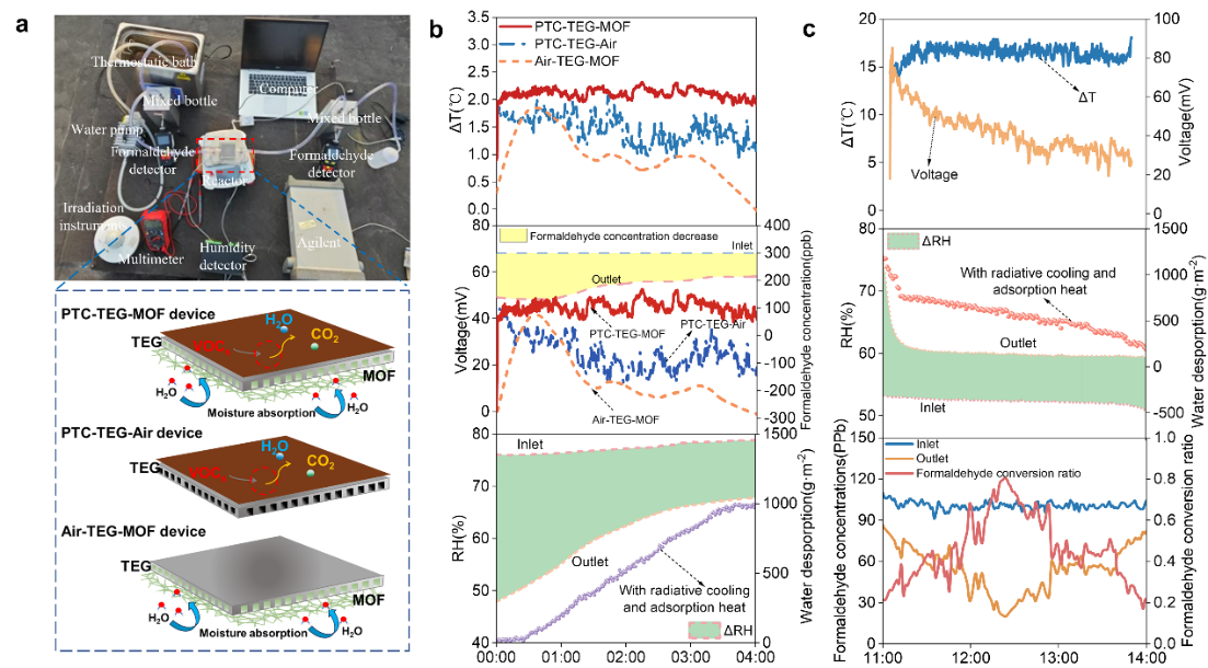 图3 PTC-TEG-MOF混合系统运行原理及实验测试结果